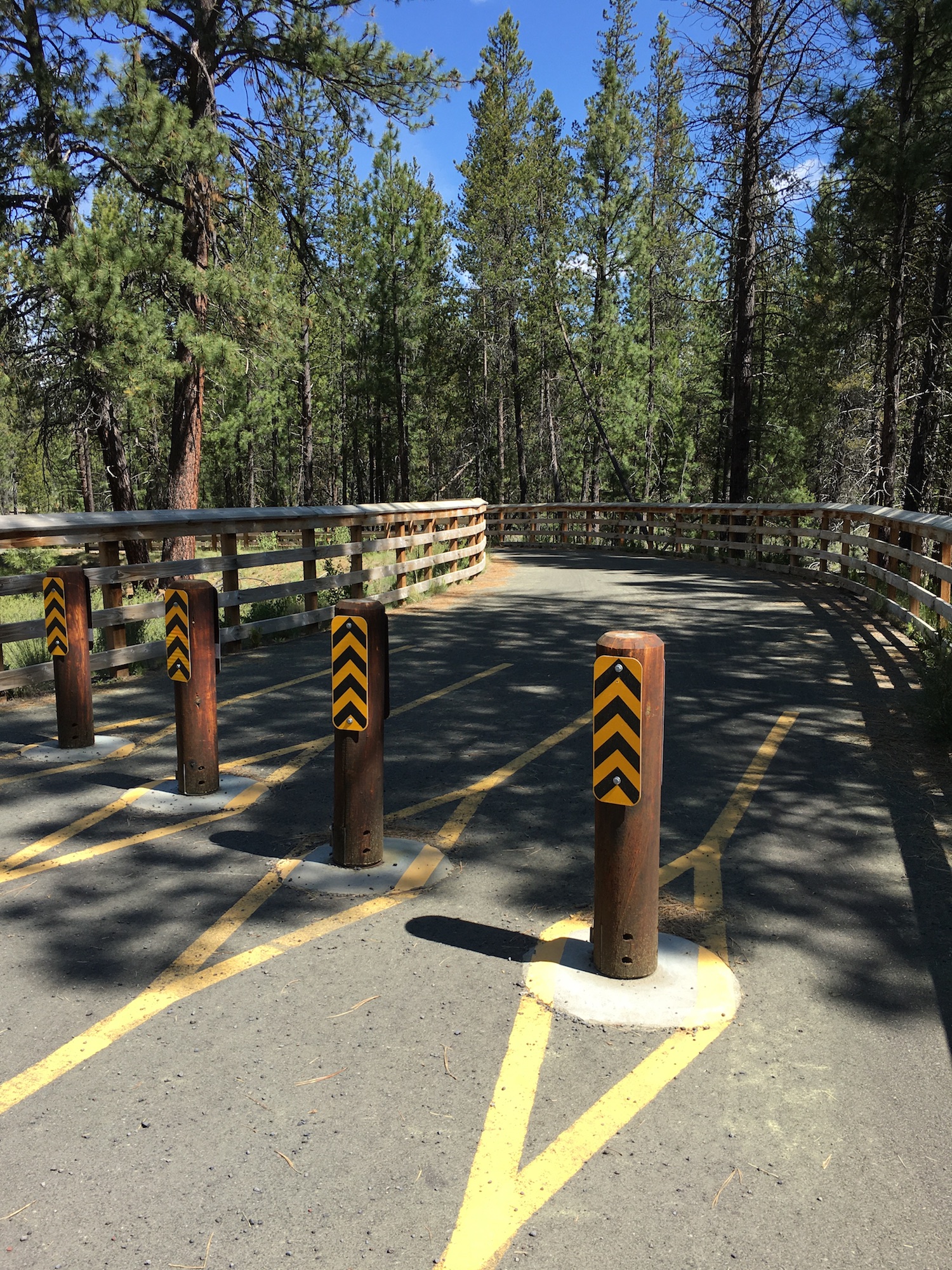 - Vehicle traffic barrier posts where bike path begins after railroad crossing. 3 – 5 ft spaces allow for foot and cycling traffic to pass through.