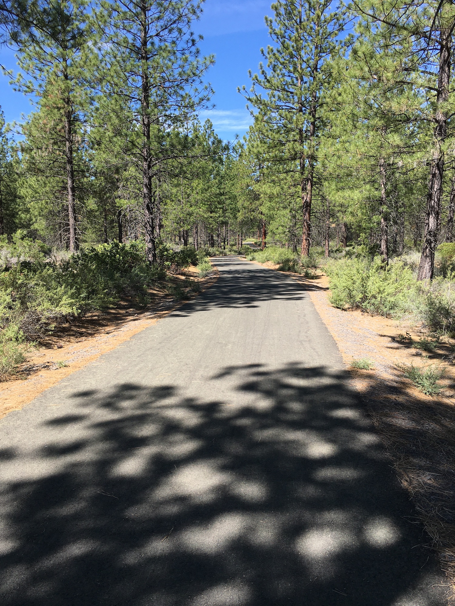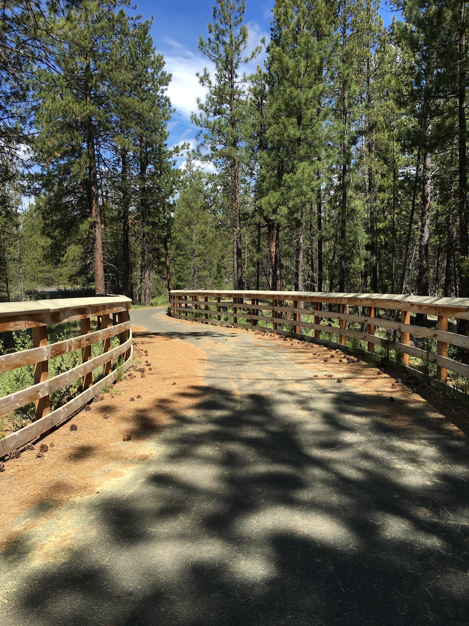 The 7.6 mile, out and back path is smooth, wide, and gently sloped downhill from the Lava Lands Visitor Center to the Benham East Trailhead and foot bridge. Sustained grades vary between 1-5%. Although there are no notable short steep slopes, the return ride back to the Lava Lands is a sustained gradual uphill ride, and does require some effort. The easiest way to experience the entire trail is by cycling, but it is also enjoyable by foot or mobility device depending on how far you plan to travel. Approximately 2.5 miles going downhill, the paved trail briefly merges with road NF-9702 in order to cross a set of railroad tracks, then splits again once past the tracks. The Benham Falls wooden footbridge marks the 3.8 mile marker and halfway point of the Sun-Lava trail.