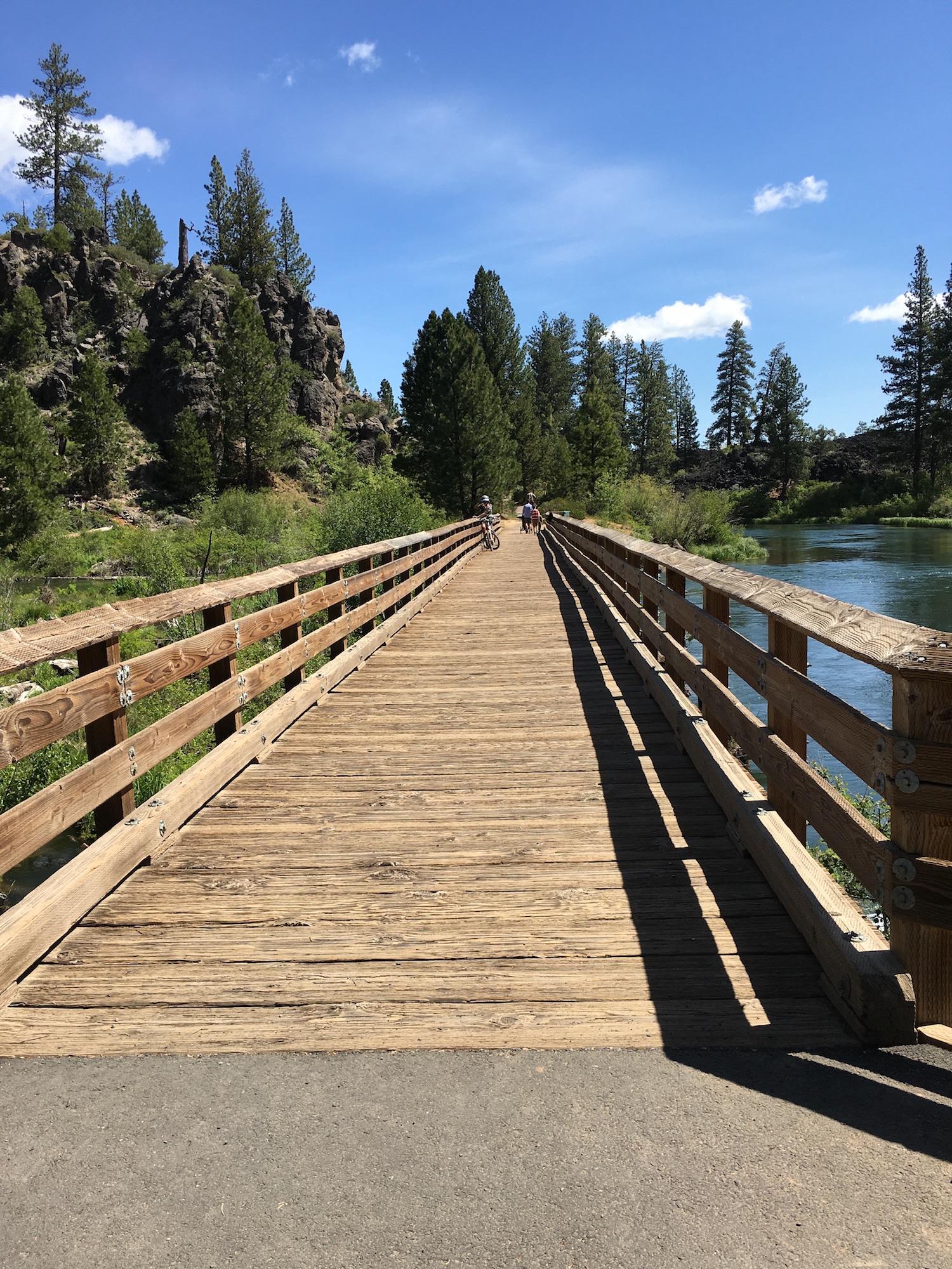This is a great cycling route for those looking to do a little more mileage. Starting from the Lava Lands Visitor Center, the wide paved trail cruises slowly downhill along a black lava field and through the ponderosa pines. Over the course of approximately 3.8 miles, the path descends about 350ft as it heads toward the Deschutes River and away from Highway 97. Along the way, keep an eye out for ground squirrels and lizards stirring throughout the brush. Also, listen for the whispering pines, as a gentle breeze moves through the peaceful forest. Most users enjoy this trail for a leisurely bike ride or walk with their dogs. With rolling and sustained grades between 1-5%, it does take more consistent effort on the return ride back. The Benham Falls wooden footbridge marks the end of the Sun-Lava pavement and turnaround spot. Before heading back enjoy a cool breeze from the foot bridge over the Deschutes River.