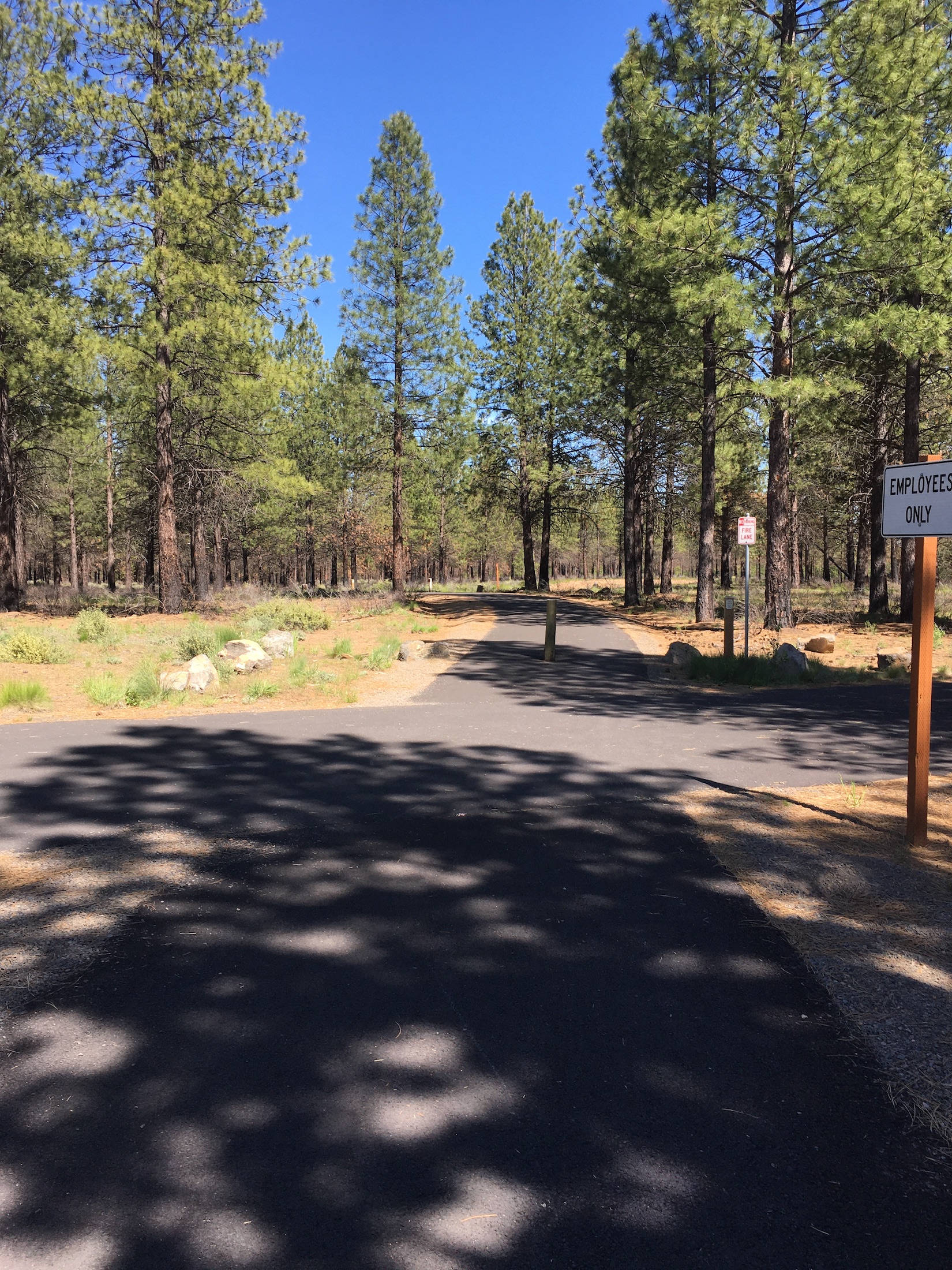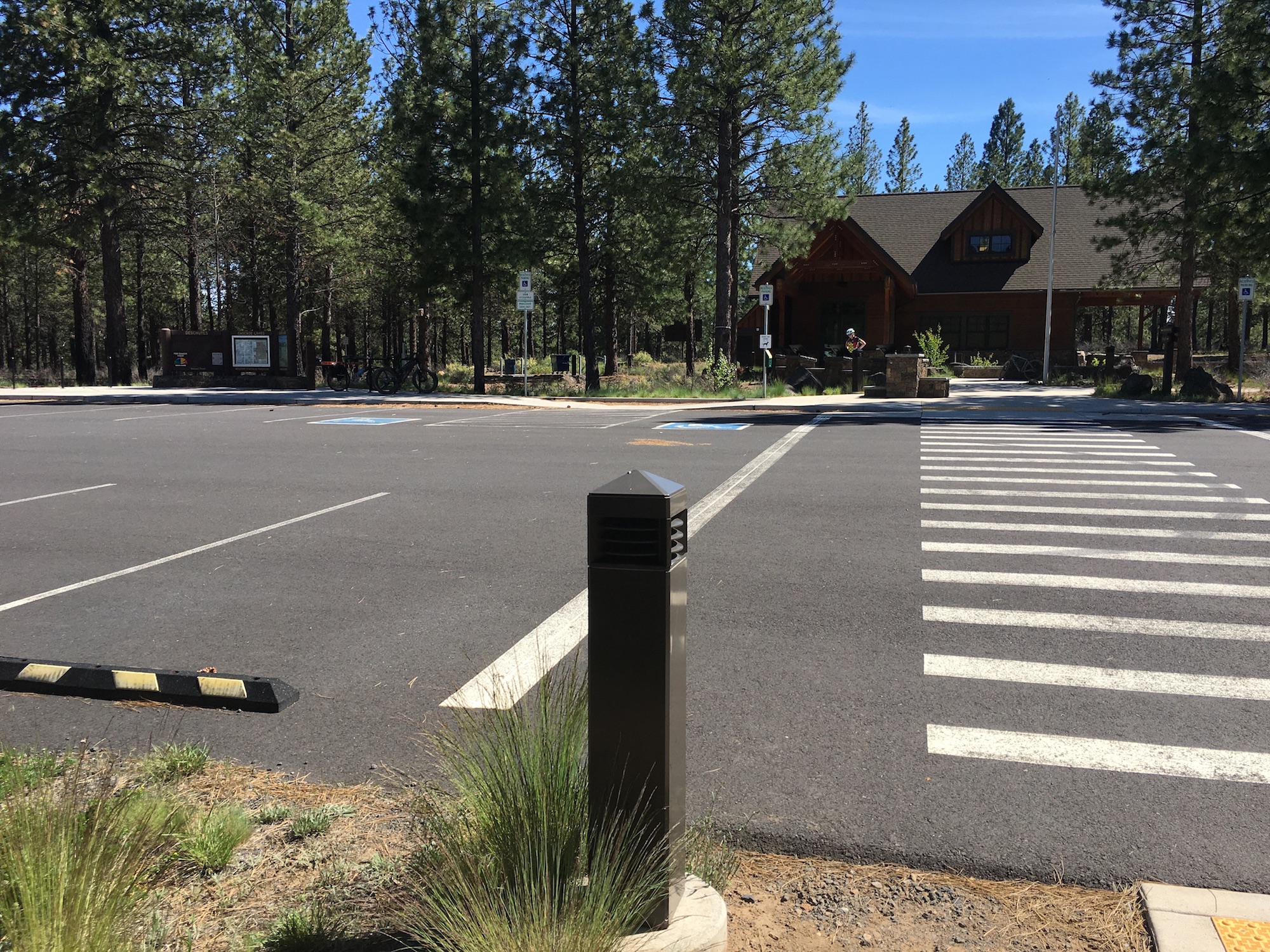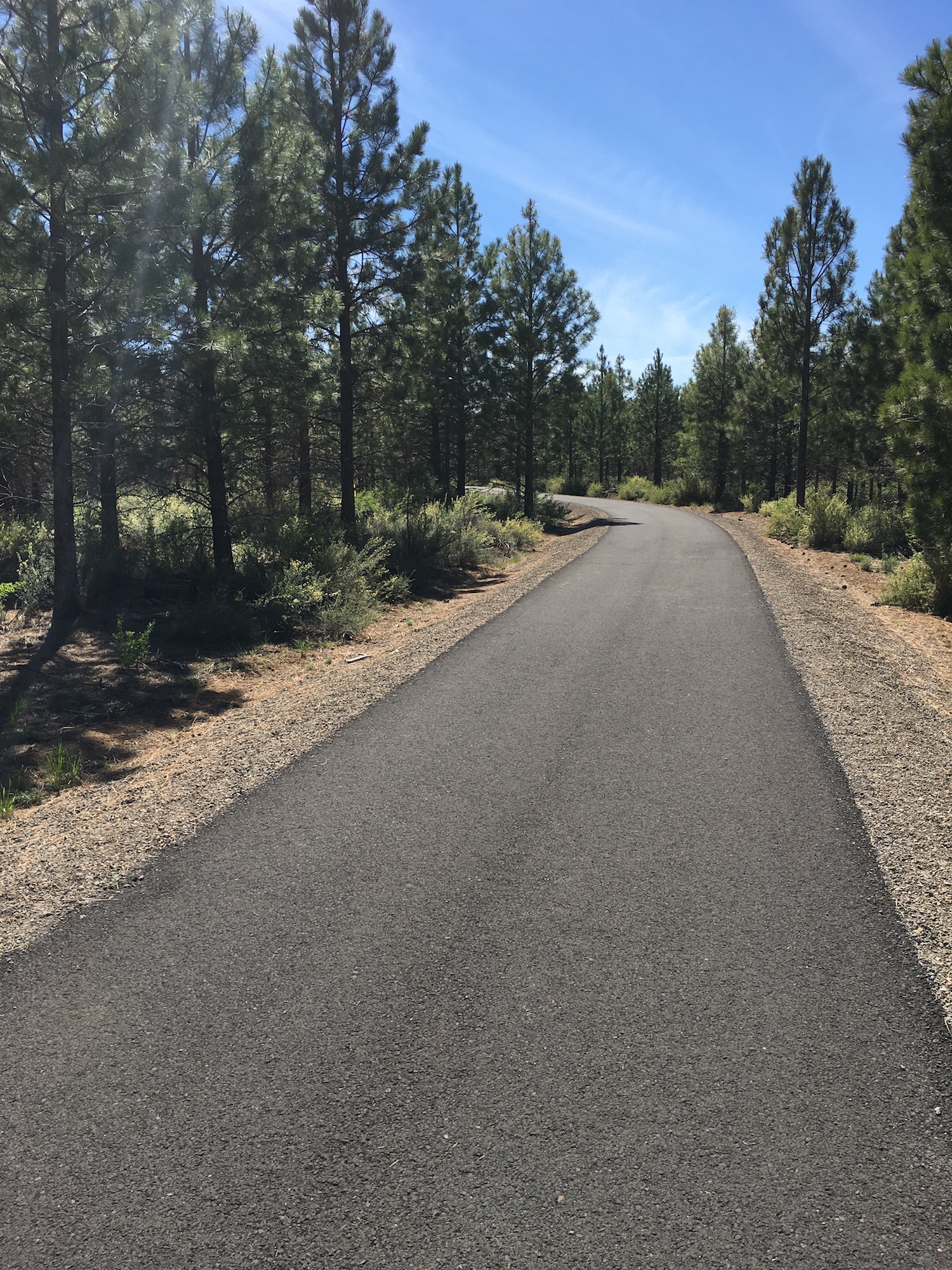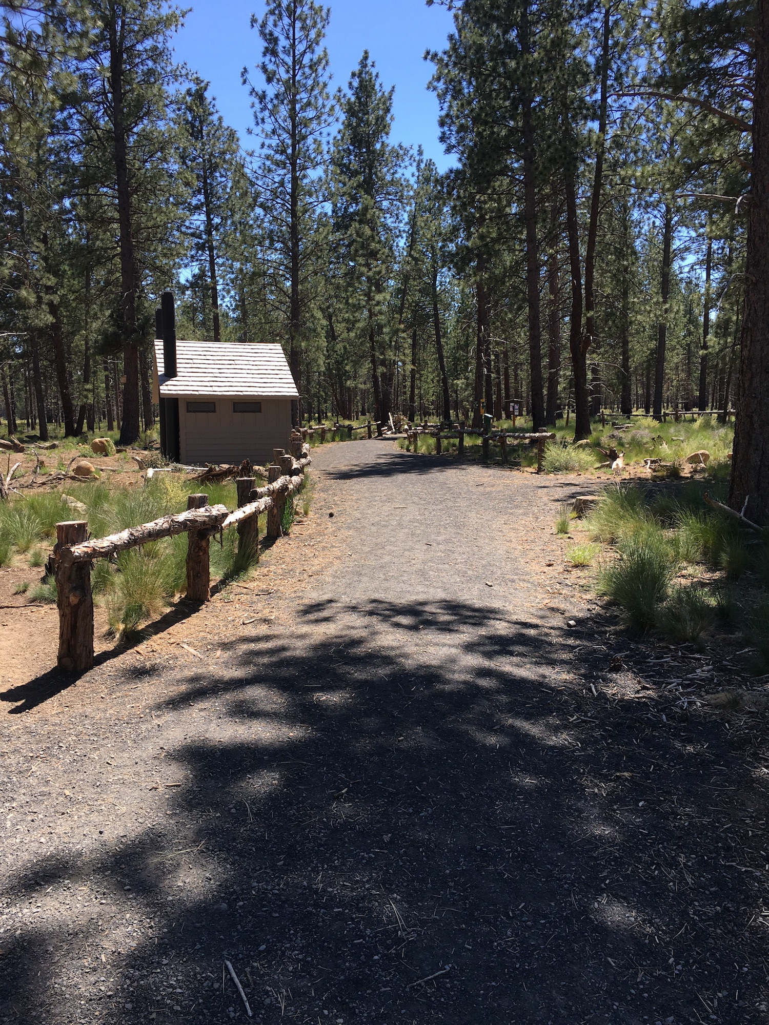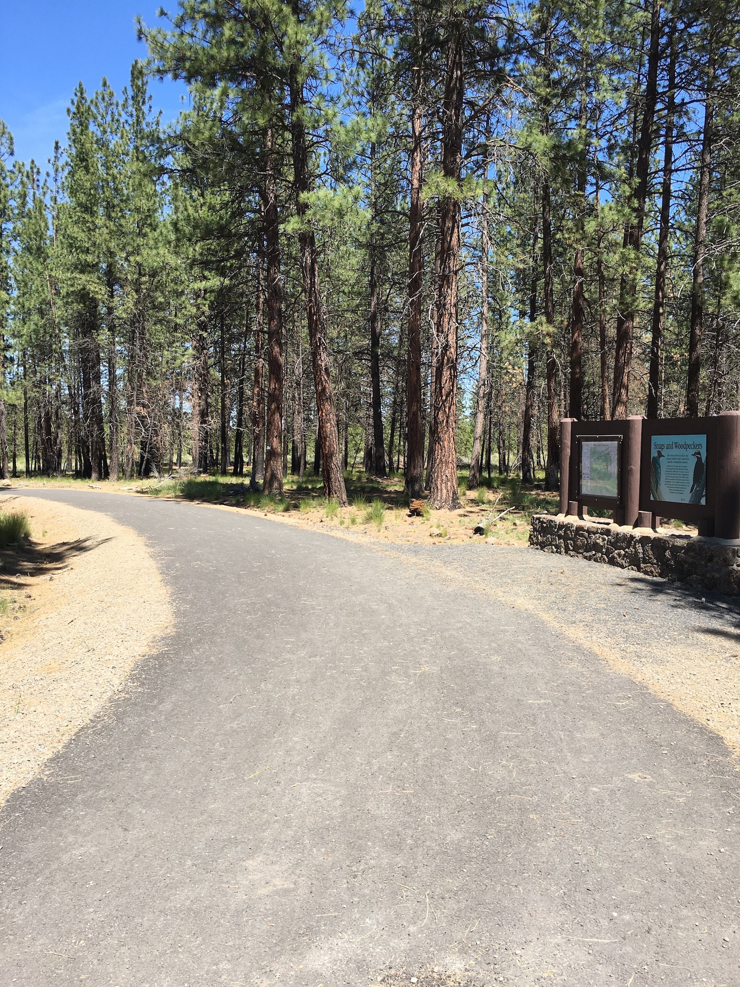 Upon entry, a steep slope of about 6.5% from the underpass quickly flattens out to a gradual and rolling uphill climb. The path is a consistent, comfortable climb for the first couple miles, with some flowy, sweeping turns as it ascends 150ft over the course of 2.8 miles. At approximately mile 2.0, the grade becomes a little steeper with longer sustained climbs at about a 4% grade until the paved trail reaches the ranger station. The ranger station marks the halfway turnaround point and a great place to take a rest before enjoying the coast back down. When open, the ranger station has running water, rustic ADA restrooms, ADA parking, and information about the trails, lakes, and wildlife within the Deschutes National Forest.