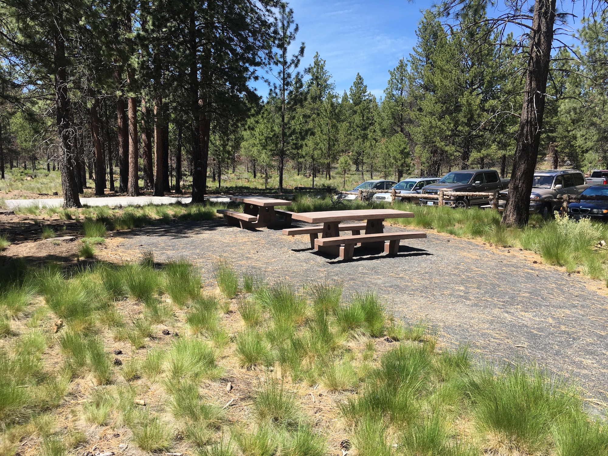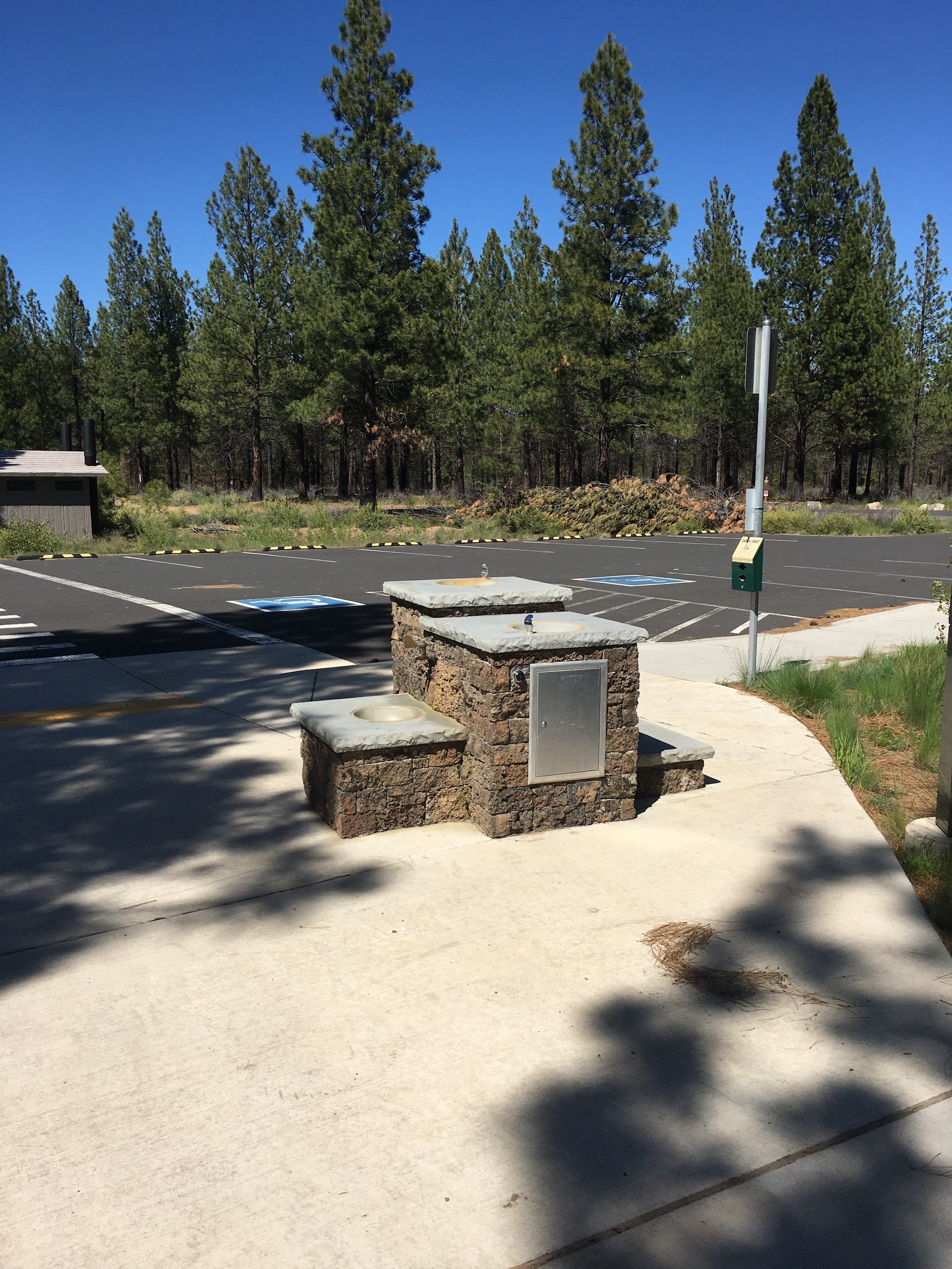 A large gravel parking area offers rustic amenities including restrooms, a small picnic area, and a map of the area with some information about the natural surroundings. This parking area offers access to both the paved Rimrock Trail and the GoodDog! off leash trail system where many locals bring their pets to roam off leash. The Rimrock Trail begins from the NE corner of the parking area and veers left through an underpass of the Cascade Lakes Highway to mark the start of the trail.
