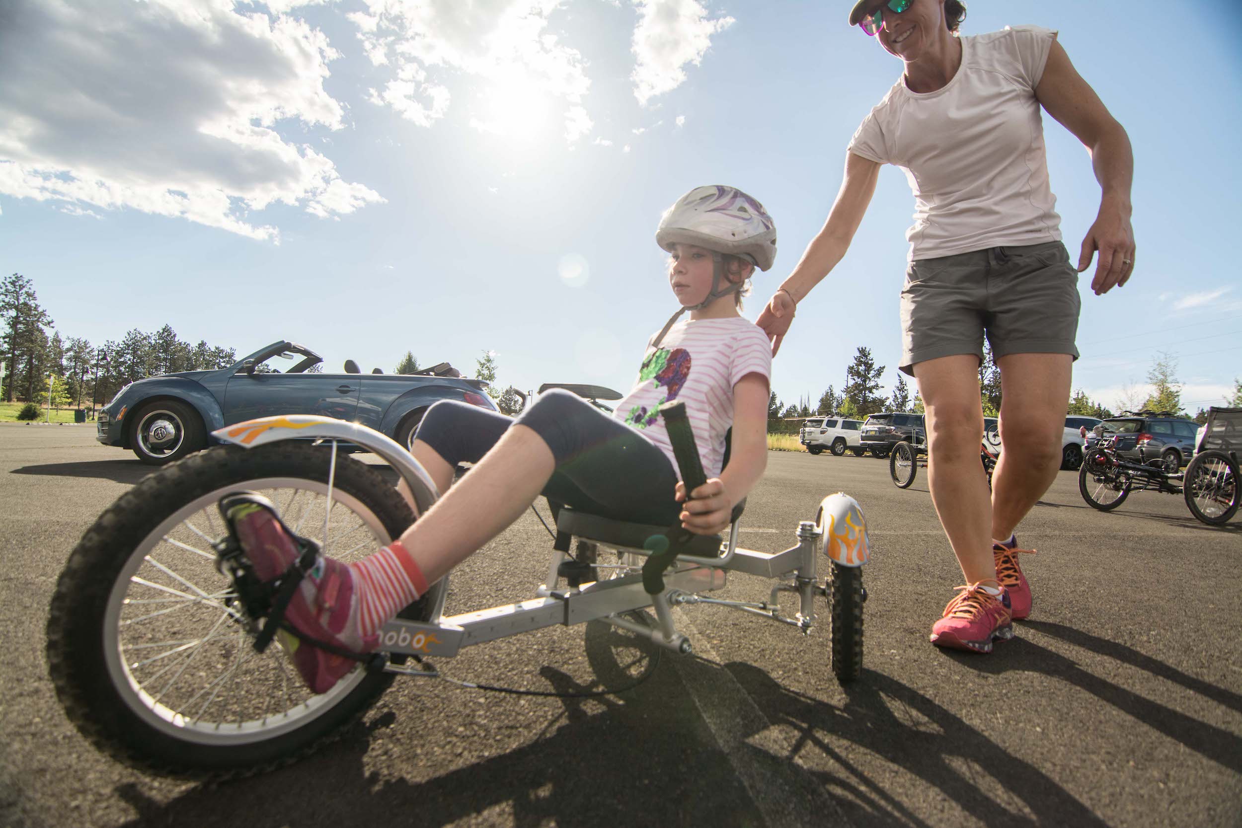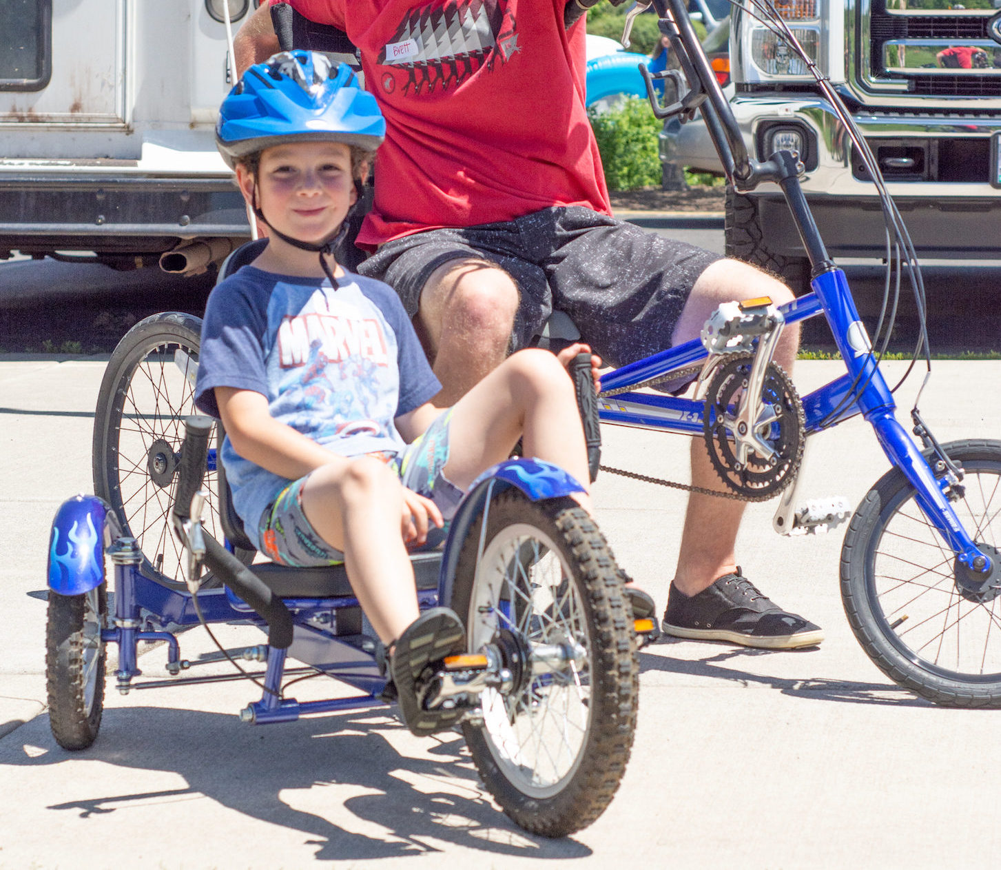 The next category of adaptive cycles is the recumbents. In Central Oregon there is an entire store in Tumalo dedicated to these cycles (for adults). A recumbent is a cycle that places the rider in a laid-back reclining position, most of these have two wheels up front and one in the back. Mobo makes a variety of youth recumbent cycles (they even have a Disney one!) and OAS has two on it’s fleet.