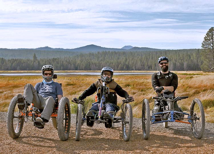 Dave riding an adaptive mountain trike with two other adaptive cyclists from Craig Hospital in 2021.